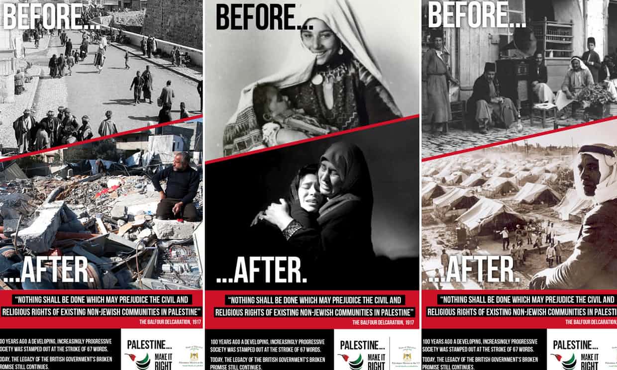 Therese May keerde zich gisteren in haar toespraak bij het galadiner, in aanwezigheid van Netanyahu, tegen het ‘hardnekkige antisemitisme’ dat kritiek op Israël omzet in een ontkennen van het bestaansrecht van de Joodse staat. Dat kritiek op Israël nog steeds gevoelig ligt bleek enkele weken geleden al uit de weigering van het Londense openbaar vervoerbedrijf om plaats te bieden aan advertenties waarin de reizigers werden geconfronteerd met de gevolgen van de Balfour Declaration. De posters van de campagne Make it Right, in opdracht van het Palestijnse gezantschap, geven een beeld van een vredig Palestina vòòr 1917 en de verwoestingen van Palestijns gebied sindsdien.