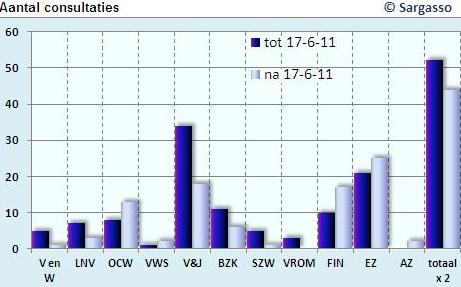 Het aantal consultaties is na 17 juni 2011 iets teruggelopen. In de experimenteerperiode verschenen er 105 consultaties, daarna waren dat er 88. Ook vallen grote verschillen tussen de ministeries op. Ministeries die volgens het onderzoek “Alle regels tellen”(2004) een hoge productie van regelingen kennen, hebben minder consultaties gepleegd dan ministeries die een lagere productie hebben.