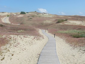 [foto’s van boven naar benenden: het wandelpad door het het Lielais Ķemeru tīrelis moeras (Kemeri-park, Letland) zilverreiger in het Kanieris meer (idem), duinen op de Koerse Schoorwal bij Nida (Litouwen), luchtspiegeling in het Lielais Ķemeru tīrelis moeras]
