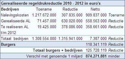 De bedragen die bij de periode oktober 2010 tot 31 december 2012 horen geven een netto regeldrukreductie van ruim 125 miljoen euro, slechts 13 procent van het door minister Kamp genoemde resultaat.