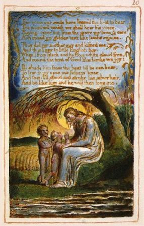 De Wikipedia definieert kunstenaarsboeken als kunstwerken, uitgevoerd in verschillende (boek)vormen. Eén van de allereerste kunstenaarsboeken zou Songs of Innocence and of Experience (1789 – 1794) van William Blake zijn. Hij illustreerde zijn gedichten zelf, zijn vrouw verzorgde inkleurwerk en het bindwerk en ze brachten het boek in eigen beheer uit. Een pagina uit Songs of Innoncence and of Experience.