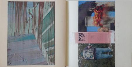 Nu niet in een expositie te zien, maar wel helemaal door te bladeren op zijn website, zijn de drie kunstenaarsboeken van Harry Haarsma. Klik op zijn website op ‘Veronica’ en ‘(aan)tekeningen’ en ‘Slapeloos’. Uiterst associatieve dagboeken of notitieboekjes, waarin hij zijn waarnemingen ordent en en met een schilderij op reageert. Hier een pagina uit ‘Slapeloos’.