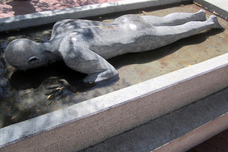 “Pelgrimage’ is een sculptuur van Zhang Huan. Het beeld verwijst naar zijn performance in 1998. Hij lag zo’n tien minuten naakt op een blok ijs. Het stond symbool voor hoe hij met New York wilde kennismaken (‘ik wil de stad voelen zoals ik het ijs voel’).