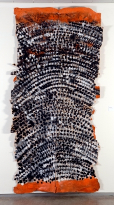 In ‘Lakens, kranten en walvisvet’ combineert Korsmit een aantal lakens met pigment schilderijen.