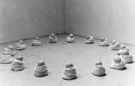 KoZ: In je laatste Trajektvoorstellingen speelden weckflessen en jampotten gevuld met bijvoorbeeld “premature groenten” of kleine schepseltjes, een rol. Bijvoorbeeld in “Walls with Premature Vegetables Jamjars and Quails” (1996, in het Kielder Forest, UK). “Hotel Krupp” (1996, Duitsland) en “Gaten in de polder” (1997, Almere). We zien ze terug in je huidige werk.