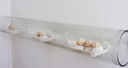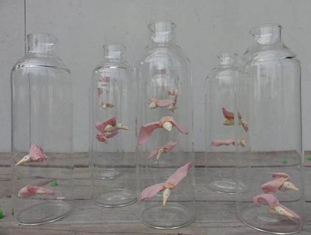 WP: “De weckpotten kwamen gewoon uit de kelder van mijn oma. Die had een enorme kelder onder haar huis waar je in kon lopen met deuren die je door kon naar de volgende ruimte. Lang geleden had ze ingemaakt en op planken stonden die lege potten in rijen. Nu gebruik ik glas omdat het een kader geeft. Het isoleert en toch kun je er doorheen kijken. Een wereld in een wereld”.