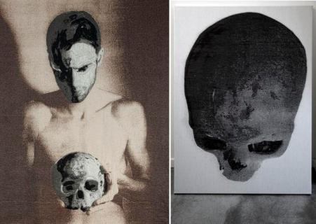 Anke Land heeft een serie wandkleden gemaakt waarop de schedel figureert.