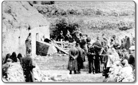 Toen ik terugkwam van mijn omzwerving, bereikte een vreemd, klagend geluid me met tussenpozen, meegevoerd door de westenwind. Toen ik de top van een heuvel aan de zuidkant van de vallei bereikte, zag ik een lange, bonte stoet zich een weg banen die vanuit Suisnish naar de overkant leidde. De stoet stopte bij het punt in de weg tegenover Kilbride, en daar werd het geweeklaag lang en luid… Iedereen was in tranen; … en het leek alsof ze zich niet los konden rukken. Toen ze weer op pad gingen, steeg een rouwkreet op naar de hemel; de lange, klagende klaagzang, als een begrafeniskreet, werd hervat; en nadat de laatste emigranten achter de heuvel waren verdwenen, leek het geluid in één lange, troosteloze toon door de hele brede vallei van Strath te galmen.