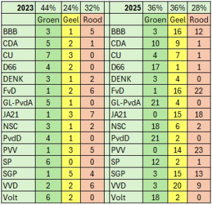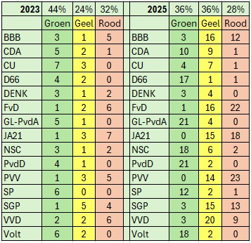 Zelfs meer dan bij de vorige Tweede Kamerverkiezingen (2023). Bron: NOvA – Rechtsstatelijke toets van de verkiezingsprogramma’s 2025; Groen = Plannen die de rechtsstaat kunnen verbeteren of versterken; Geel = Plannen die een risico vormen voor de rechtsstaat; Rood = Plannen die in strijd zijn met beginselen van rechtsstatelijkheid