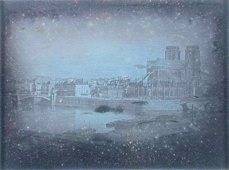 [foto’s: Bouw Notre Dame met links Stephanus in afbraak (boven), ijzeren siersmeedwerk van Biscornet (midden) en Daguerre’s Notre Dame en Île de la Cité in 1838 (hieronder)]