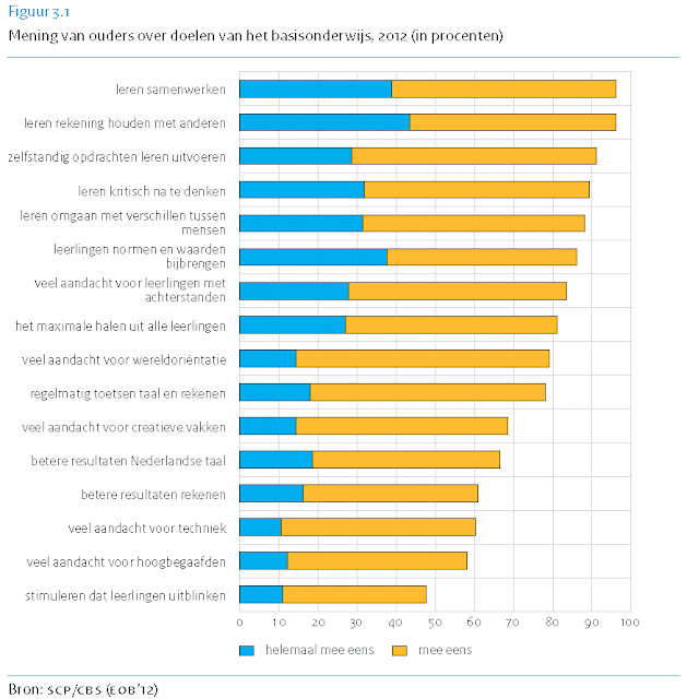 Maar wat zegt dat nou? Misschien is die 10% “helemaal mee eens” op het doel: “stimuleren dat leerlingen uitblinken”, wel precies voldoende. De managementgoeroe Jack Welch constateerde immers al dat in iedere populatie van werknemers steeds 10% excellent is. Als dit de ouders zijn van excellente, hoogbegaafde of zeer ambitieuze leerlingen, dan is dat dus precies goed.