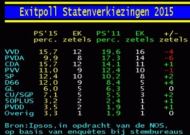 Eerste exit poll wijst op verlies voor VVD, PvdA en PVV. Grootste winnaar lijkt D66 te worden. OSF lijkt één zetel te winnen, hetgeen betekent dat een aantal lokale partijen het goed hebben gedaan.