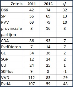 Volgens de peiling van Maurice de Hond van 15 maart gaan VVD, PvdA en 50Plus de verliezers worden. Alle andere partijen winnen. D66 koploper met een winst van 32 zetels. Op afstand volgen de SP (13 zetels winst) en de PVV(10 zetels winst. Bij de kleinere partijen valt op dat de Partij voor de Dieren haar provinciale zetels wellicht gaat verdubbelen (van 7 naar 14 zetels). Voor het totaal aantal provinciale zetels ziet de prognose er zo uit: