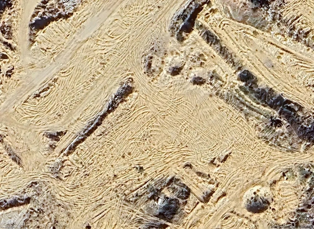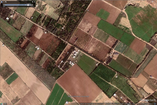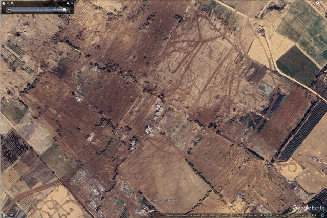Op sommige plekken levert het zelfs een vorm van kunst op waar de rupsbanden zich rond de – deels verwoeste – bebouwing vlechten in ingewikkelde patronen. Hier een voorbeeld van 1 december 2024 op 31°32’33.45″N 34°27’8.76″O, waar niet zoveel groen is omgeploegd maar wel de snelweg langs de kust, die u niet meer ziet in de noordwesthoek van de foto.