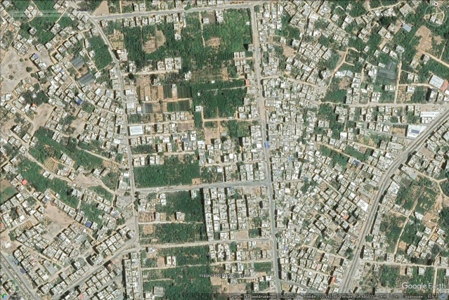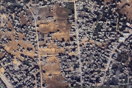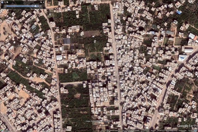 Wat u daar ziet zijn tanktracks, op elke vierkante centimeter tussen de bebouwing heeft de rupsband van een tank gereden. Dit zijn twee plekken in Gaza, 48 dagen later. En wat u hier ziet, kunt u op Google Earth op meer plekken in Gaza zien. Een strook van 7 kilometer lang langs de kust bijvoorbeeld, vanaf de bestandslijn uit 1947 naar het zuiden, van ongeveer 600 tot 1500 m breed is op de schop gegaan. Niet alleen is alle groen er verdwenen, alle ruimte tussen de huizen, ook waar geen groen was, bestaat uit uitsluitend tanktracks van iets meer dan drie meter breed.