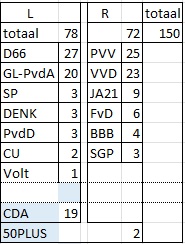 Met de exitpoll in gedachten zal dat niet zo snel meer voorkomen. Een eensgezind rechterblok heeft meer zetels dan een aaneengesloten linkerblok. Hoe groot de meerderheid ter linker- of rechterzijde zal zijn, hangt vooral af van het CDA. Buigen de christendemocraten naar links, en 50PLUS naar rechts, dan hoeven slechts drie zetels uit het linkerfront over te hellen naar rechts en dan zijn er weer hoofdelijke stemmingen nodig.