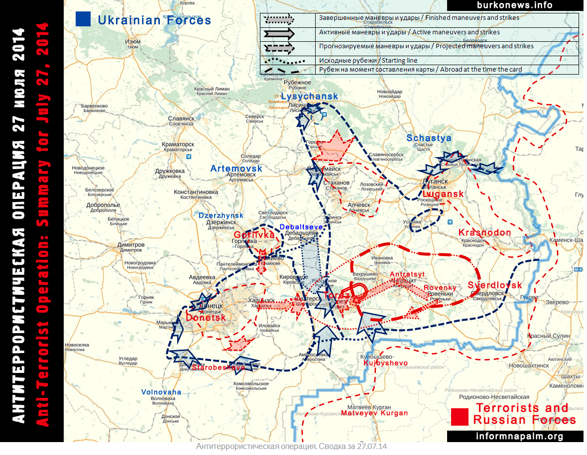 Het Oekraïense leger staat al weken voor Donetsk. Belangrijke terreinwinsten zijn de afgelopen week vooral elders geboekt, onder andere bij Lugansk dat inmiddels nagenoeg omsingeld is en langs de grens met Rusland, die inmiddels weer grotendeels in Oekraïense handen is. Strategisch gezien is dat laatste trouwens ook veel effectiever dan de steden proberen te veroveren. Als het leger de laatste paar grensovergangen in handen krijgt, zullen de duizenden Russen het front snel verlaten en over de grens terug vluchten, om te voorkomen dat ze in Oekraïense handen vallen en zo aantonen hoe groot de Russische rol in de opstand was. Bovendien is het dan ook gedaan met de stroom wapens en munitie die vanuit Rusland Oekraïne ingereden wordt.